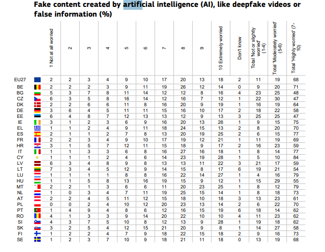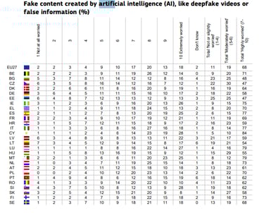 În unele state membre, îngrijorarea față de conținutul înșelător generat de AI depășește media UE: de exemplu, până la 84% în Cipru, 79% în Malta și Luxemburg, sau 73% în Țările de Jos și Finlanda. Aceste diferențe sugerează că expunerea la deepfake-uri și alte forme de manipulare digitală influențează mai puternic opinia publică în anumite contexte naționale, amplificând cererea pentru reglementări mai stricte la nivel european.