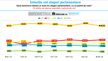 AUR rămâne lider detașat în intențiile de vot pentru parlamentare: 38% în martie 2026, sub pragul de 40% față de ianuarie