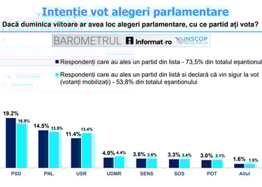 Pe pozițiile următoare se situează PSD cu 19,2%, PNL cu 14,5% și USR cu 11,4% (raportat la respondenții care aleg un partid). UDMR este creditat cu 4%, SENS cu 3,6%, SOS România cu 3,3%, iar POT cu 3%. „Alt partid” și „Independent” adună procente mai mici (1,6% și respectiv variații). Raportat strict la cei care declară că ar vota sigur (53,8% din eșantion), distribuția este similară: AUR 38,6%, PSD 16,9%, PNL 13,9%, USR 13,4%. Diferențele între PSD și PNL (3-5 puncte) și între PNL și USR (1-3 puncte) rămân constante în funcție de baza de calcul.