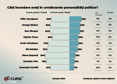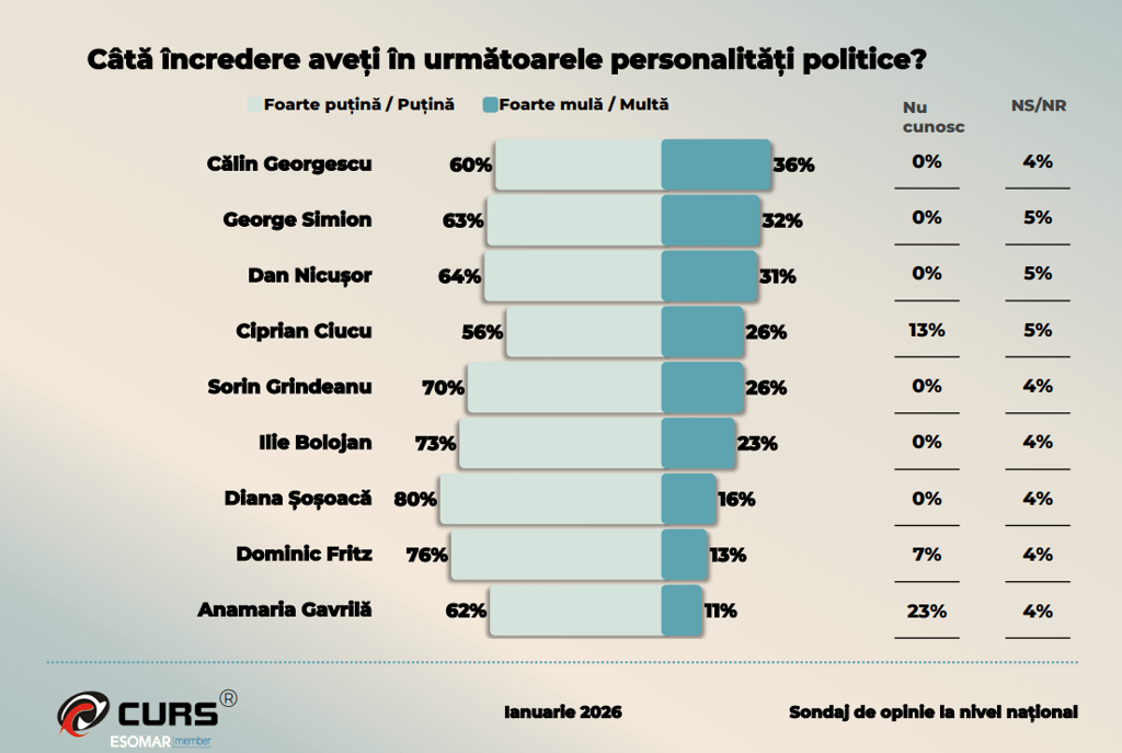 Sondajul CURS realizat în ianuarie 2026 plasează pe Călin Georgescu în fruntea clasamentului încrederii în personalități politice, cu 36% dintre respondenți exprimând o evaluare pozitivă („multă” sau „foarte multă” încredere). Acest procent îl poziționează înaintea altor figuri politice majore, deși rămâne sub pragul majoritar, reflectând o încredere limitată în ansamblul clasei politice.