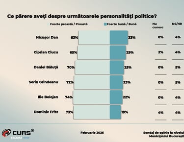 Imaginea principalilor lideri politici evaluați în Capitală este preponderent negativă, potrivit aceluiași sondaj realizat de Centrul de Sociologie Urbană și Regională - CURS.