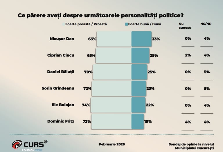 Sondajul a fost realizat de Centrul de Sociologie Urbană și Regională - CURS în perioada 12–20 februarie 2026, pe un eșantion de 1.069 de persoane adulte din Municipiul București. Marja de eroare este de ±3%, la un nivel de încredere de 95%.
