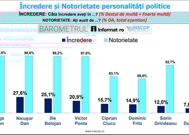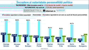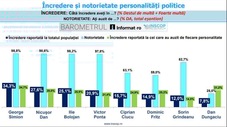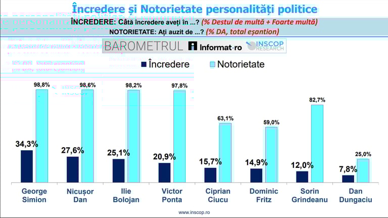 Analiștii INSCOP subliniază că pentru figuri precum Ciprian Ciucu, Dominic Fritz, Dan Dungaciu și, parțial, Sorin Grindeanu, nivelul încrederii este influențat direct de gradul mai redus de notorietate. În clasamentul notorietății (cunoașterea persoanei de către public), conduc tot George Simion (98,8%), Nicușor Dan (98,6%) și Ilie Bolojan (98,2%), însă ordinea se modifică ulterior: Victor Ponta are o notorietate de 97,8%, în timp ce Sorin Grindeanu este cunoscut de 82,7% dintre respondenți. La polul opus, Ciprian Ciucu are o notorietate de 63,1%, iar Dan Dungaciu de doar 25%.